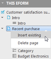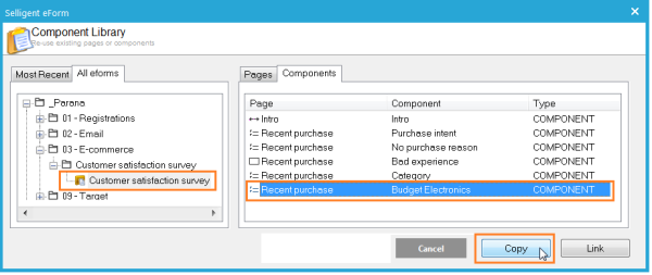8. The next two questions are the same as the previously defined "No Purchase reason" and "Bad experience" questions. Right-click the page name in the top left corner and select 'Insert existing' again. Find your survey and click on the 'Components' tab. Select the "No Purchase reason" component. Although question 7 is (almost) the same as "No Purchase reason" we will select 'Copy'. The reason for creating a copy and not linking to an existing component (see next step) are 'Rules'.