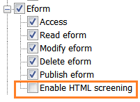 For security reasons, when adding content in Form, users can be restricted from using certain HTML tags when the user right 'Enable HTML screening' is checked. In this case only white listed HTML tags and attributes can be used. Currently this is a fixed set of tags and cannot be modified.
