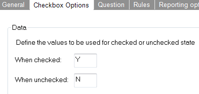- On the 'Checkbox options' tab you can define the values stored when this checkbox is checked or unchecked: here "Y" or "N"