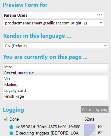 You can preview your work at any time by clicking 'Test' in the top bar. Before you test make sure the survey is saved and the database is updated. You can select a test user and survey page on the right side. Under logging you can see each step Form does to generate the survey page.