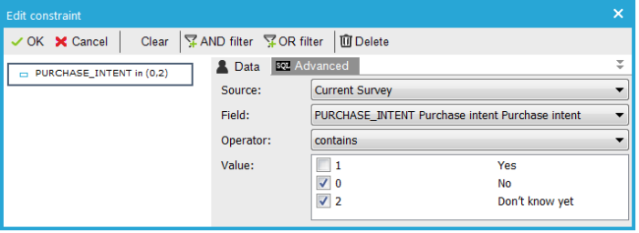4. Add a conditional constraint. Click 'Edit' and enter a constraint when "Purchase intent" is "0 - No" or "2 - Don't know yet"