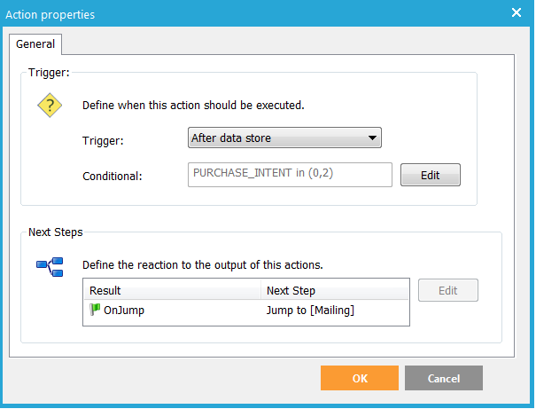 5. Under 'Next steps' select the 'OnJump' event and click 'Edit'. Select 'Jump to page' 'Mailing'.