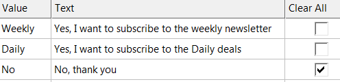 - Answers: Values: Weekly - Daily - No, Text: Yes, I want to subscribe to the weekly newsletter - Yes, I want to subscribe to the Daily deals - No, thank you