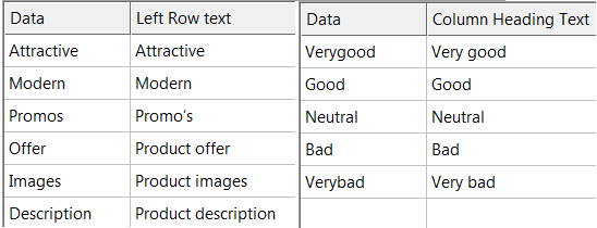 For matrices the data is stored as follows: Attractive_Good,Modern_Neutral,Promos_Verygood, etc. where the text before the underscore (_) is the selected row and the text after the underscore the selected column.