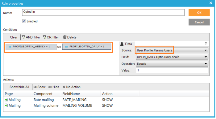 11. Add a rule to show "Rate mailing" and "Mailing volume" when the contact is subscribed to either newsletter. You can select values from the audience list to define your constraint.