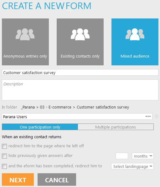2. Select 'One participation only'. The contact will only have one record for their participation in the survey list. If they participate more than once, their record will be overwritten (i.e., their answers will be updated). The survey list will have a 1-on-1 relation with the audience list. This is an extended profile of the audience list.