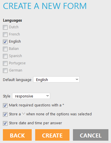 7. The option 'Store date and time per question' will keep track of the exact moment each question is answered by storing the date and time in a separate table called 'SURVEY_XXX_DT' with XXX being the number of the survey.
