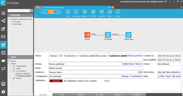 1. Select 'Form' from the main menu on the left. Select a folder and create a new survey "Customer satisfaction survey". Set the audience to "Mixed" and select your test audience list.