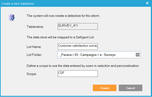 10. At the top click 'Update DB'. The 'Create a new data store' panel will open. You can't change the table name, but you can change the name of the list. Select a folder and enter 'CSF' as a scope. A scope is used to identify the relation between the audience list and the survey list. In the first step we have selected 'one participation only'. The survey list will have a 1-on-1 relation with the audience list. Thus, is an extended profile of the audience list. The 'scope' name identifies this relation.