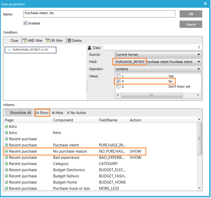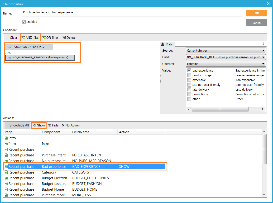 5. Add a rule to show "Bad experience" when "No purchase reason" is "Bad experience". This is a little tricky, because there is also are also linked component "Bad experience". Actually, we have to check on the combination of "No purchase reason" and "Purchase intent".
