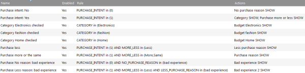 10. And a rule to show the "Purchase reason" component when "Purchase intent" is "1 - Yes" and "Purchase more or less" equals "more" or the "same"