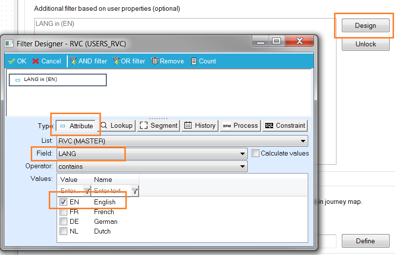 4. We are going to select only the English speaking contacts. Double-click the Audience component to open its properties. Click 'Design' to open the Filter Designer. The 'Filter Designer' provides a visual way of creating SQL constraints. Under 'Attribute', select the 'LANG' field from the audience list. Because this field has an option list linked to it with all the possible language values, we can simply check the value "EN" under 'Values'. Your constraint is ready, click 'OK' when done.