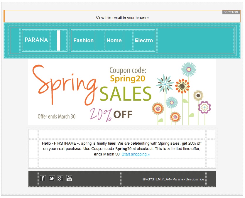 In the footer you should now see "© ~SYSTEM.YEAR~ Parana - Unsubscribe"