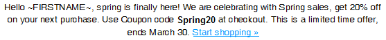 We are going to keep it simple, change the first sentence "Spring is finally here!" to "Hello ~FIRSTNAME~, spring is finally here!":