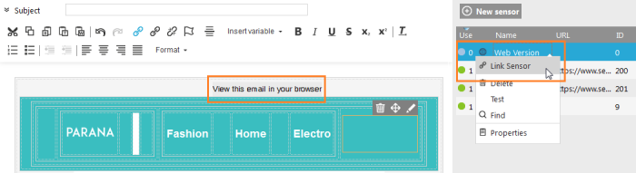 Open the sensor overview panel on the right side. You can see that the web version sensor is not yet used. We need to link the sensor to the text "View this email in your browser". This can be a bit tricky, like in our example, many times the original HTML file you have imported, already has a hyperlink created for this, with a hash (#) as hyperlink reference. Usually with styling added to the hyperlink. In the example code it looks like this: