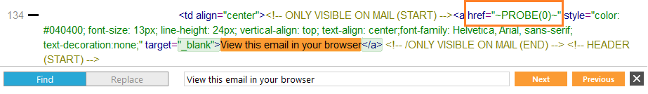 1. To avoid this we will change the hyperlink reference in the source code. Click the 'Source' tab at the bottom. Press Ctrl+F to find the text "View this email in your browser". You should see the hyperlink (A-tag). Change href="#" to href="~PROBE(0)~". PROBE(0) is a function that creates a hyperlink in the eventual email for sensor 0, the web version sensor. The number between the brackets is always the sensor ID, PROBE(200) would create a hyperlink for sensor 200.