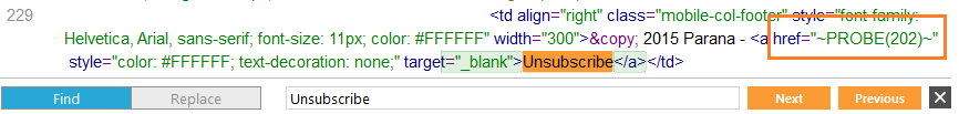 3. Click the 'Source' tab at the bottom. Press Ctrl+F to find the text "Unsubscribe". You should see the hyperlink (A-tag). Change href="#" to href="~PROBE(202)~". PROBE(202) is a function that creates a hyperlink in the eventual email for sensor 202, which is our unsubscribe sensor. If your unsubscribe sensor has a different ID, fill in that ID.