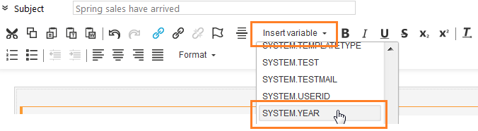 1. Select "2015" in the footer and from the top bar open the 'Insert variable' drop-down. Select SYSTEM.YEAR