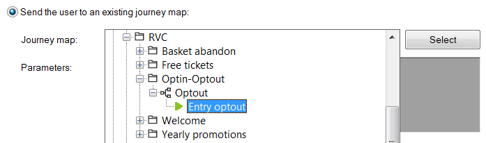 2. Give it an name "Unsubscribe" and select the second radio button 'Send the contact to an existing journey". Click 'Select' and find your test optout journey. Double-click the Input component in the test optout journey.