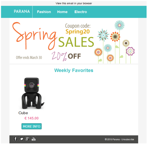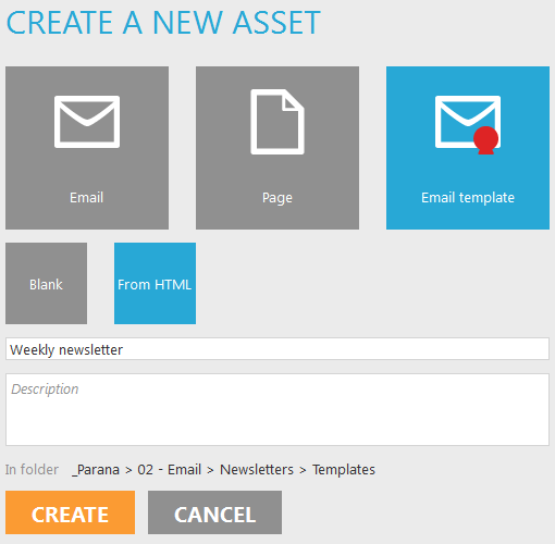 1. Import the html. On the support portal, under 'Tips, Tricks & Guidelines' you can find a zip file 'Parana-basic-template.zip' with the example HTML to import. Download and unzip it on your local drive. It contains one HTML file 'parana-basic-template.htm' and an 'images' folder next to it. Create a new asset in the Editor. Select "Email template'" and "From HTML". Import the HTML. The imported email looks like this in the editor: