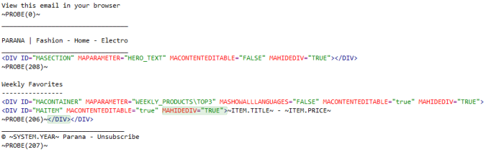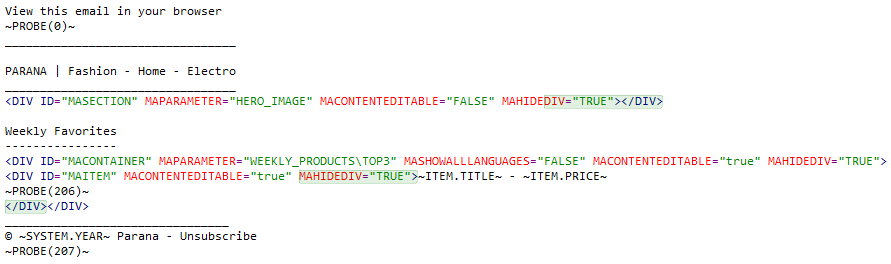 - Remove the web version DIV tags, but not the content in between the DIV tags. Add the web version sensor on a new line below the text "View this email in your browser".