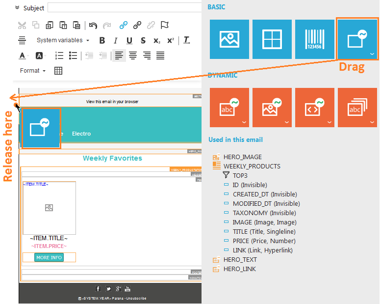 9. From the Components panel, drag and drop a Dynamic Section in front of all content in the email.