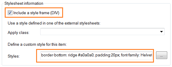 12. On the 'Style' tab check 'Include a style frame (DIV)' and enter a custom style "border-bottom: ridge #a0a0a0; padding:20px; font-family: Helvetica, Arial, sans-serif; font-size:13px;". We want to show this in Express as a block level element, with a nice grey border