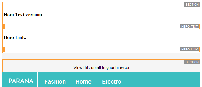 In Express the user cannot see or edit the text version itself. But we need a way to let the Express user define the content for the "HERO_TEXT" and "HERO_LINK" Dynamic Text components. We will add a Dynamic section to the html version of the email only Express users will see. This section will not be added to the eventual sent newsletters. Here, the Express user can edit the content for the "HERO_TEXT" and "HERO_LINK" Dynamic Text components.