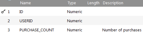 2. Add two fields: USERID (numeric) and PURCHASE_COUNT (numeric).
