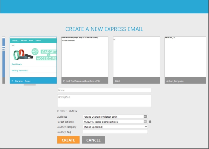 Express is a simplified context, to create newsletters. Using Express requires hardly any training. It allows the non-expert user to create newsletters based on pre-defined templates. It is a wizard driven tool where the user solely adds content and images to the newsletter. He is not confronted with HTML layout issues at any time, they do no need to worry about journeys that must be designed.
