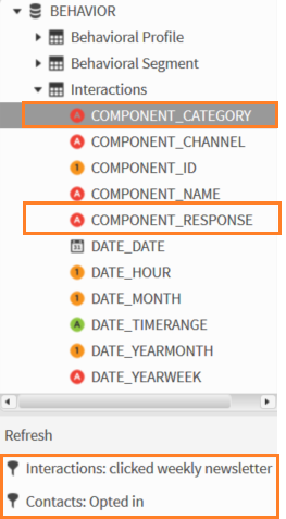 In CI, you can select all weekly newsletter clicks using the message category (COMPONENT_CATEGORY=weekly newsletter) and response (COMPONENT_RESPONSE=clicked) from the INTERACTIONS table. Rename the union of both selections to 'Interactions: clicked weekly newsletter' and leave it in the scratchpad.