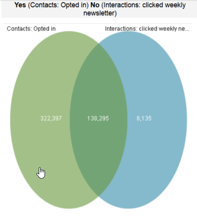 When both selections are made, create a Venn analysis and save the selection of contacts that have opted in but have not yet clicked in the Segments folder in CI.