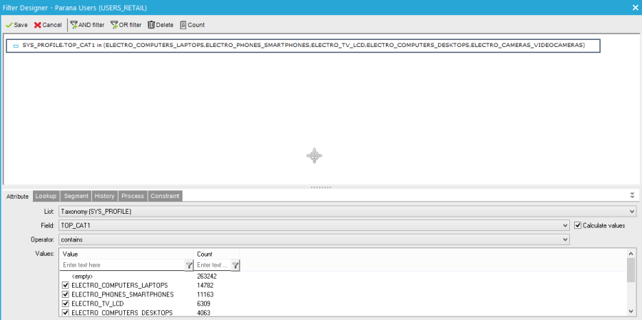 Once all this is set up you can use the information in the taxonomy profile extension to check if the top_cat1 field contains 'electronics' and retrieve all contacts that correspond to that constraint.