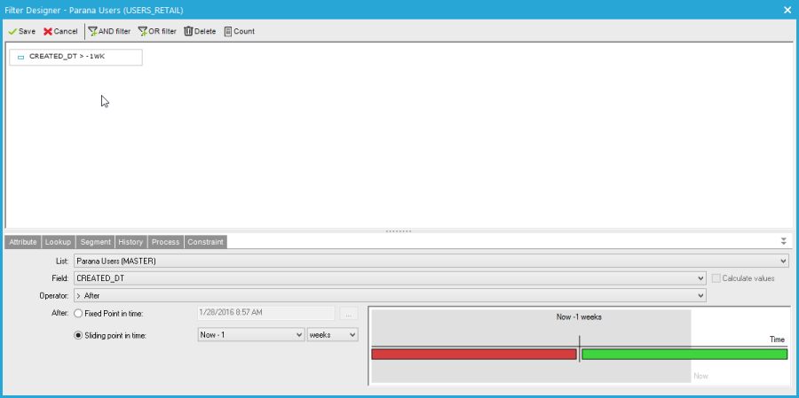 For datetime fields you can select before/after/between/not between a fixed point(s) in time, or sliding point(s) in time. If you select, like in this example, after a fixed point your selection would grow as time progresses. With sliding point, you use a time window, in this case of one week. Because "Now-1 week" will move along in time, it will always be "Now-1 week".