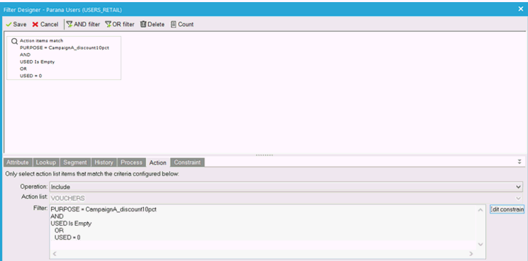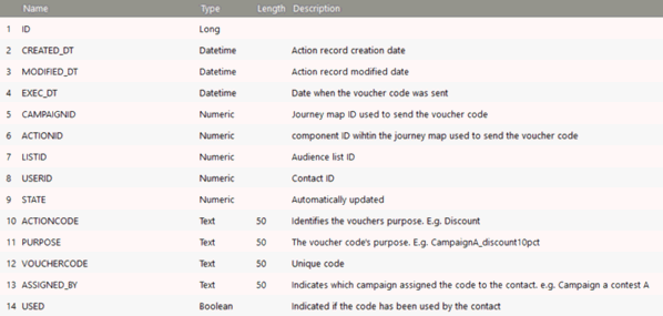 If the assigned code can be used within a Campaign journey (e.g. a subscription form in Campaign), this can be flagged in the action list, e.g. by setting a USED Boolean field to 1.