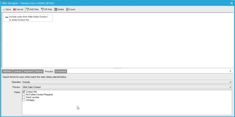 - Operation: include or exclude users from the selection based on the filter