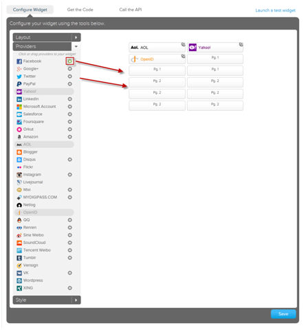 4.Drag and drop providers to the reserved spaces on the right. Janrain guides the user through the different steps and configuration options.