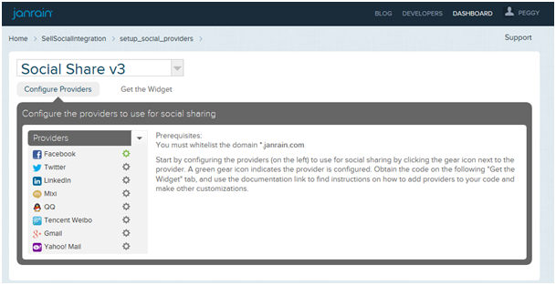2. Again, providers must be added. If providers have been configured previously for other widgets, the gear wheel is displayed in green. Else, you need to configure them now. Janrain guides the user through the different steps: