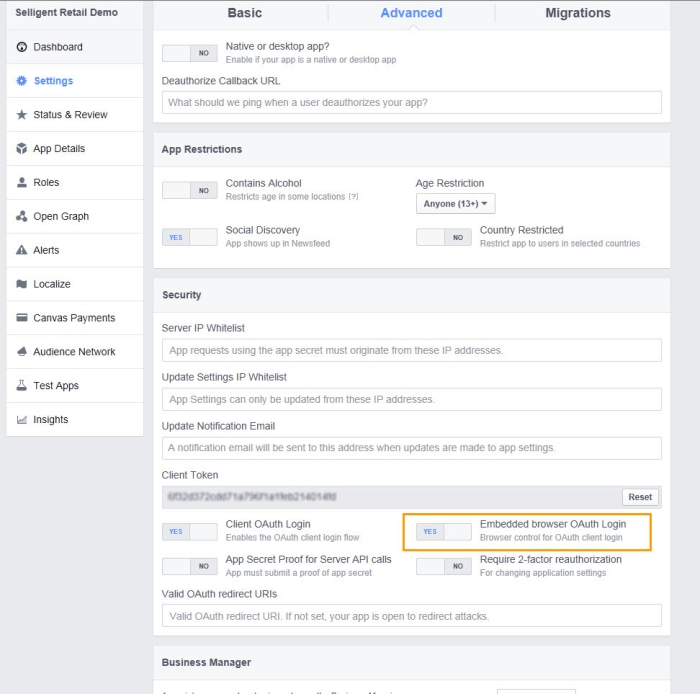 A series of configuration fields is generated and the most important one are 'AppID' and 'App Secret'. Write them down as they will be used to configure the social app in Selligent.