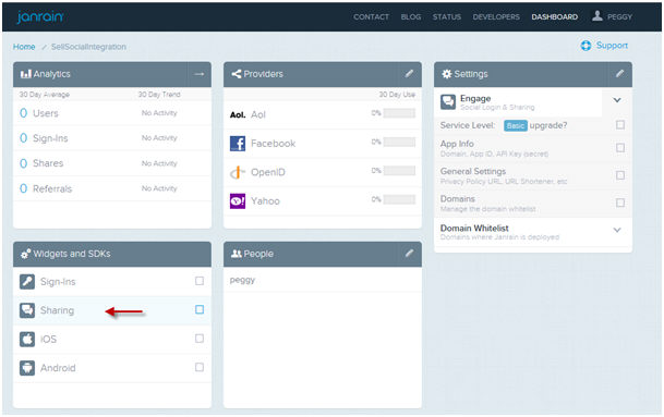1. On the Janrain dashboard, select the Sharing widget: