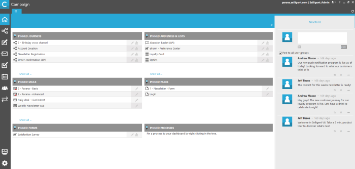 - Newsfeed — Scrolling live feed of messages, notifications and alerts from other Selligent users