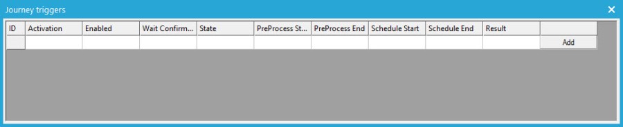 The table displays an overview of the triggers that have been defined for the current journey. Press the 'Add' button to create new triggers: