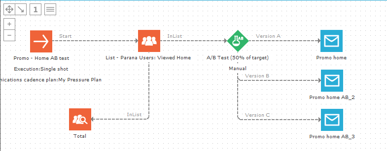 NOTE: A/B test components can also be placed just after a control group. In this case the A/B test is performed on only a segment from the initial number of contacts, based on the control group selected in the journey