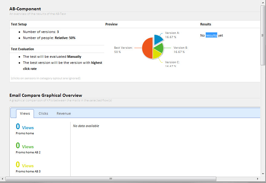 The email with the best response is used in the journey to target the remaining contacts. The best response may be based on the view rate, the click through rate, the revenue (Webtracker) or the order count (Webtracker). The length of the A/B test period determines when the best version of the email will be sent.