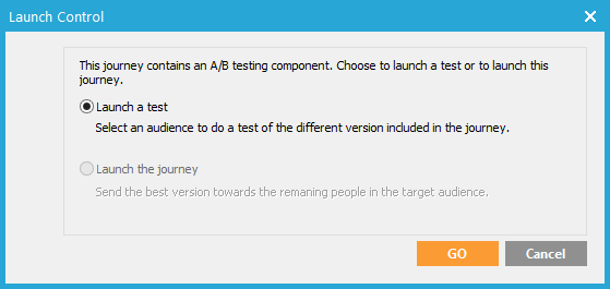 When an A/B test journey is launched the first time, a dialog appears providing a choice between 'Launch a test' or 'Launch the journey':