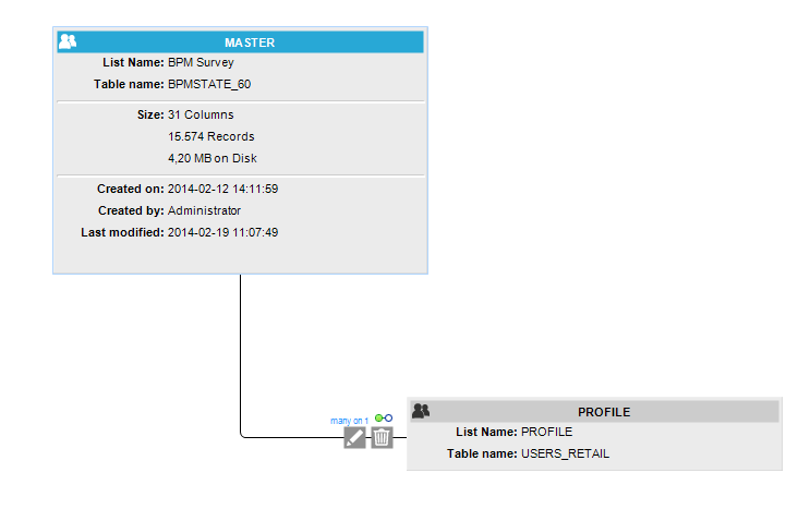 The BPM In component has its proper table associated to it. It is automatically generated. The BPM list is linked to an audience list, thus giving access to additional information, such as data in the profile extensions (previous answered surveys, etc).