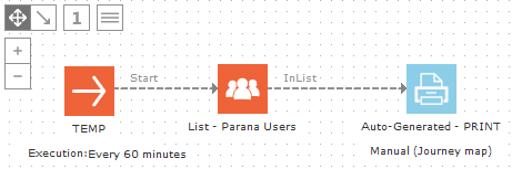 • Scheduled:  As a reference, for a scheduled Email component (default setting), an email is created for each contact in the journey audience. Usually the Email component is directly linked after the Audience component. Likewise, a scheduled Print component will generate pages in the Word document for each contact in the journey audience when the journey is executed (single shot, scheduled or triggered journeys).