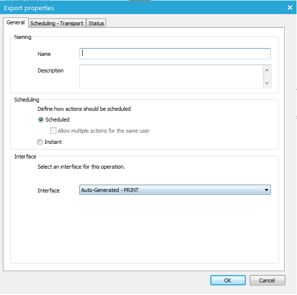 • Interface: If there is more than one 'Print' interface, you can select the correct interface from the drop-down. Interfaces are created under 'Processes' and can have a type 'Print'. So it is possible multiple 'Print' interfaces exists.