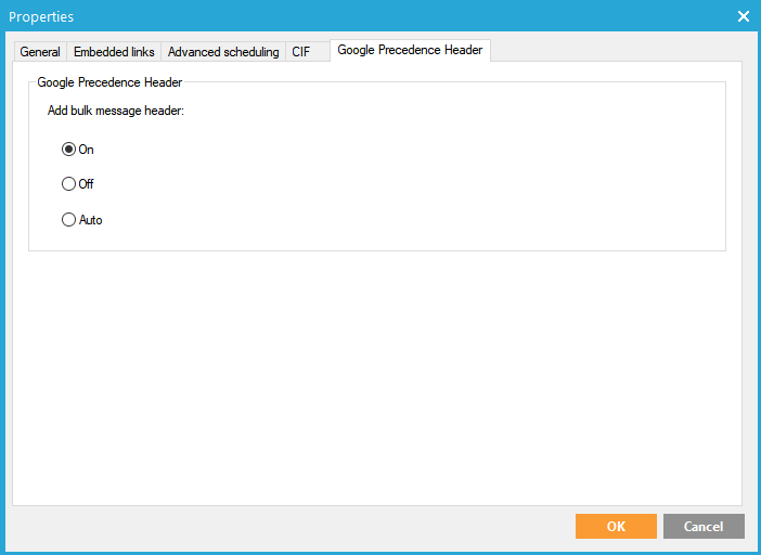 To improve deliverability on Google domains and ensure better Inbox placement, it is now possible to add a specific Google Precedence Header to a bulk email. By default no Google Precedence Header is added to your messages. Moreover, the Google Precedence Header functionality needs to be activated specifically on your environment to be able to use it. (Contact Selligent to activate it on your environment)