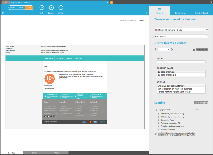 A special type of Email Component is the multivariate (MVT) email. The multivariate email allows creating multiple variants of one and the same message by combining variable subject lines, blocks of text, images and article containers. Each one of these combinations is tested against the audience and the best version is used to target the remainder of the contacts. See Multivariate testing.